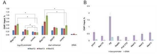To test whether the observed effects of depletion of the SAYP, Bap170, Med12, and Med13 subunits on gene expression are direct, we studied the recruitment of the subunits to gene regulatory elements by using chromatin immunoprecipitation (ChIP). First, we checked the hsp70 promoter and Dad enhancer in LexAop-LacZDad flies. We have previously shown that SWI/SNF subunits are recruited to the active LexAop-hsp70 reporter promoter and the Dad enhancer (although the activity of the latter is not reduced by knockdowns of SWI/SNF subunits) []. Using antibodies against Mediator subunits, the subunits were detected on the transgene hsp70 promoter and the Dad enhancer (Figure 4A) in LexAop-LacZDad flies. We detected both the Med15 subunit, whose knockdown did not affect transgene expression, and the Med12 and Med13 subunits, which were critical for transgene activity. Thus, despite the presence of all Mediator subunits in the system studied, not all of them are essential for transgene activity.