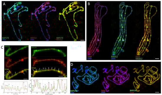 Potential genome-wide colocalization of SAYP and Bap170 with Med12 and Med13 was studied by immunostaining of salivary gland polytene chromosomes in third-instar larvae. The factors were quite often detected in the same loci of open chromatin, although their distribution profiles differed and there were few loci predominantly enriched in only one of the factors (Figure 5). The finding indicates that the cooperation of SAYP and Bap170 with Med12 and Med13 can potentially be genome-wide.