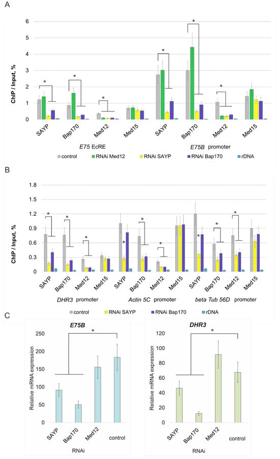 The question as to how prevalent the mechanism under study is in the genome remains open. Both coactivators are widely distributed throughout the genome, and the mechanism can be expected to contribute to regulating the activities of a large number of genes. It is known that the Mediator is a central factor of signal transduction in many signaling pathways, and the subunits of the kinase module play the most important role in this process [,,,,]. A similar function has been assumed for the SWI/SNF complex []. Our ChIP experiments showed that the recruitment of the Med12/Med13 subunits depends on the presence of SAYP/Bap170 not only on inducible genes of the ecdysone cascade but also on constitutive housekeeping genes. It is conceivable that co-occurrence of SAYP/Bap170 and Med12/Med13 may be observed at many loci.
