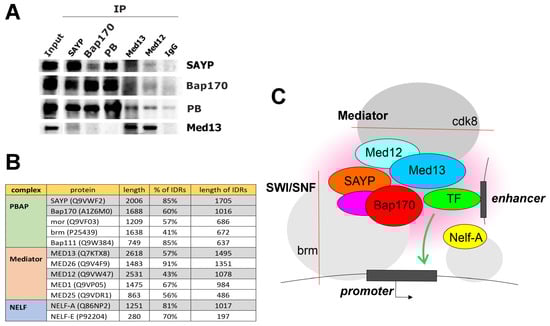 The proteins SAYP, Bap170, Med12, and Med13 are multidomain proteins of about 200 kDa, and the presence of extended unstructured domains is their common feature. The domains have been described as part of the Med12 and Med13 subunits [,], ARID family proteins (to which the Bap170/ARID2 factor belongs) [,,,], and other subunits of the SWI/SNF complex [,,]. Extended N-terminal low-complexity domains are a distinctive feature of the SAYP factor, but not its vertebrate homolog PHF10 []. Analysis of the distribution of intrinsically disordered regions (IDRs) among the subunits of the PBAP and Mediator complexes showed that the factors under study possess some of the longest IDRs (Figure 7B). The contribution of the IDRs and the related phenomenon of local phase transition to the regulation of transcription is being actively studied. In the case of SWI/SNF, the IDR domains have been shown to contribute to the formation of local condensates with other factors, the formation of a network of protein–protein interactions, localization of factors in the genome, and the fine-tuning of remodeling activity.