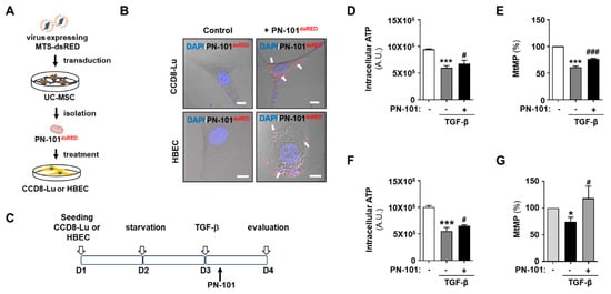 Exogenous mitochondrial transfer to human lung cells and reversal of TGF-β-induced mitochondrial dysfunction. (A) Schematic diagram of PN-101dsRED treatment into human lung fibroblasts (CCD8-Lu) and human bronchial epithelial cells (HBECs). PN-101dsRED was obtained from UC-MSCs, which were infected with a lentivirus expressing MTS-dsRED. (B) Representative immunofluorescence images. The red colored dots indicate the exogenously transferred PN-101dsRED. The cell nuclei were stained with DAPI. PN-101dsRED was successfully transferred into the CCD8-Lu cells and HBECs (white arrows). The scale bar indicates 10 μm. (C) Schematic representation of PN-101 treatment in the TGF-β-induced fibrosis model. CCD8-Lu cells and HBECs were seeded, starved in a culture medium without FBS for 24 h, and then treated with TGF-β at 2.5 ng/mL. After 6 h, various PN-101 concentrations were administered for 24 h. Intracellular ATP and mitochondrial membrane potential (MtMP) were measured in CCD8-Lu cells (D,E) and HBECs (F,G), respectively. PN-101 treatment significantly attenuated the TGF-β-induced decrease in ATP and MtMP levels. All data are presented as mean ± SEM. * p < 0.05 and *** p < 0.001 versus control and # p < 0.05 and ### p < 0.001 vs. PN-101 non-treatment.