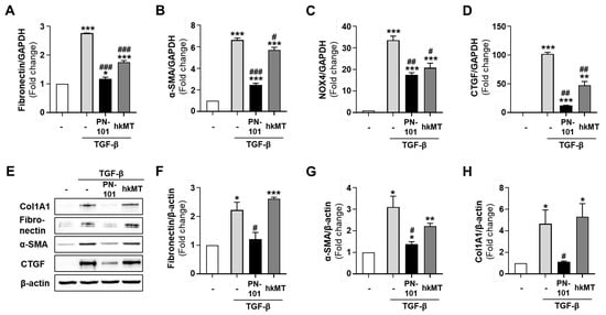 CCD8-Lu cells were plated 2 × 105 in 6-well plates and cultured for 24 h. Cells were cultured with serum-free DMEM for a further 24 h. TGF-β of 2.5 ng/mL was added to induce the fibrotic process. After 6 h, the cells were treated with 20 µg of PN-101 or hkMT for 18 h. Total RNA was isolated from the cells with the TRIzol reagent (Life Technologies, Carlsbad, CA, USA, 15596026). The synthesis of complementary DNA (cDNA) was performed with an M-MLV cDNA synthesis kit (Enzynomics, Daejeon, Republic of Korea). Quantitative real-time PCR analysis was conducted with the MIC magnetic induction cycler (BioMoleculer Systems, Seoul, Republic of Korea) using a 2xSYBR Green (Phile Korea, Seoul, Republic of Korea). The specific primer sequences include human GAPDH antisense, 5′- ACC ACC CTG TTG CTG TAG CCA A -3′, human GAPDH sense, 5′- GTC TCC TCT GAC TTC AAC AGC G -3′ and human fibronectin antisense, 5′- GTG GCT GAA GAC ACA AGG AA -3′, human fibronectin sense, 5′- CCT GCC ATT GTA GGT GAA T -3′ and human α-SMA antisense, 5′- TCC CAC CAT CAC CCC CTG ATG TC -3′, human α-SMA sense, 5′- GCC CAG CCAA GC ACT GTC AGG A -3′ and human CTGF sense, 5′- GGC TTA CCG ACT GGA AGA C -3′, human CTGF antisense, 5′- AGG AGG VGT TGT CAT TGG -3′ and human NOX4 Antisense, 5′- GGC TCT GCT TAG ACA CAA TCC -3′, human NOX4 Sense, 5′- CAC CTC TGC CTG TTC ATC TG -3′. The activation comprised 95 °C for 2 min and cycling conditions comprised 95 °C for 10 s and 60 °C for 20 s. The value of each gene expression was normalized to that of GAPDH.