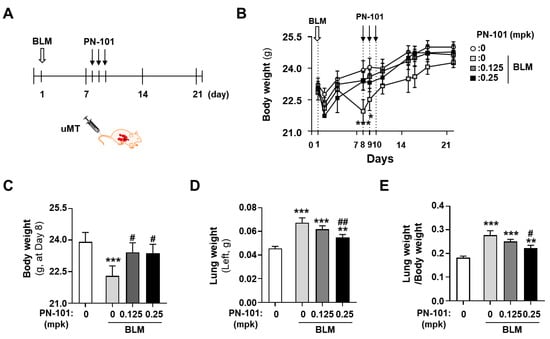 Effect of mitochondrial transplantation on body weight and lung weight. (A) Schematic representation of PN-101 administration to BLM-induced mice. The mice were intratracheally instilled with BLM of 0.33 mpk and intravenously injected three times with 2.5-μg PN-101/head (0.125 mpk) or 5-μg PN-101/head (0.25 mpk) 7 days after the BLM treatment. (B,C) BLM instillation decreased body weight and was restored to normal with PN-101 treatment. (D,E) BLM treatment increased lung wet weight even when expressed relative to body weight. * p < 0.05, ** p < 0.01, and *** p < 0.001 versus sham. # p < 0.05 and ## p < 0.01 vs. PN-101 non-treatment.