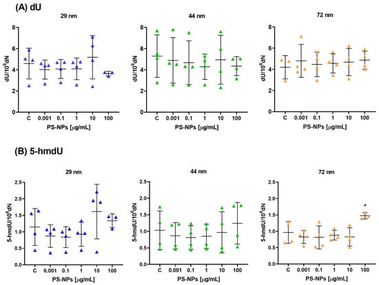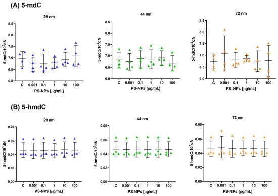 2.1. Effect of PS-NPs on DNA Methylation Determinants (5-mdC, 5-hmdC, dU and 5-hmdU) in Peripheral Blood Mononuclear Cells