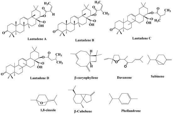 Figure representing dominant volatile and non-volatile phytochemicals reported in extracts and essential oils of L. camara.