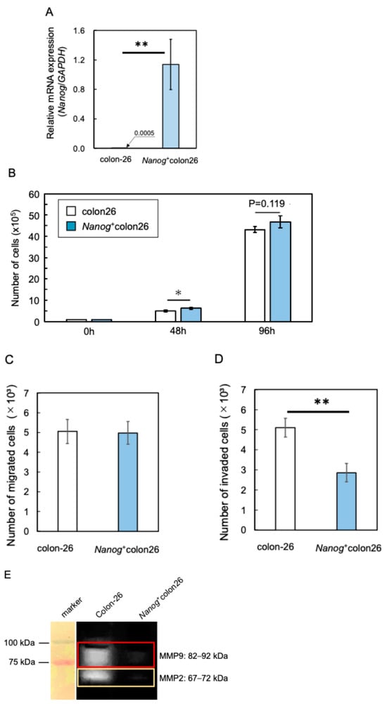 Properties of Nanog⁺colon26 cells. (A) Relative expression of mRNA of Nanog; mean ± SD for n = 3. (B) Proliferation activity; mean ± SD for n = 3. (C) Migration activity; mean ± SD for n = 3. (D) Invasion activity; mean ± SD for n = 3. (E) Matrix metalloproteinase activity; mean ± SD for n = 3. **: p < 0.01; *: p < 0.05.