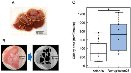To quantify the liver metastasis, colon-26 cells or Nanog+colon26 cells (1.0 × 10⁶ cells/50 µL PBS) were injected into the spleen of 8~9-week-old mice. Two weeks following the injection of cells, the mice were euthanized by cervical dislocation, and the livers were removed (Figure 2A). The livers were sectioned into lobes and photographed. The tumors in the images were made black using the Image J software, and the surface area of the tumors was calculated (Figure 2B).