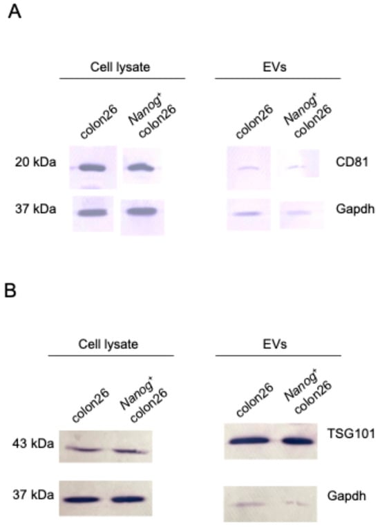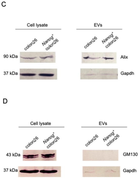 Western blotting performed to confirm the presence of Nanog+colon26EVs markers: (A) CD81, (B) TSG101, (C) Alix, and the absence of a negative marker, (D) GM130. Gapdh: loading control.