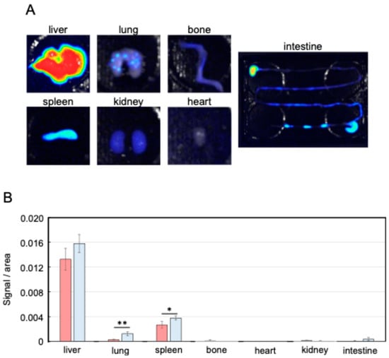 Distribution of EVs in the body. (A) Fluorescent images of NIR815-labeled Nanog+colon26EVs accumulated in each organ. (B) Accumulation of Nanog+colon26EVs (■) and colon26EVs (■) in each organ; mean ± SD for n = 3; ** p < 0.01; * p < 0.05.