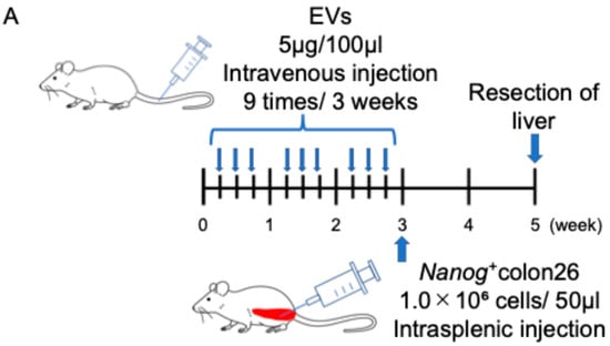 Effects of Nanog+colon26EVs on liver metastasis. (A) Timeline of EV and cell administrations. (B) Effect of colon26EVs; number of mice PBS: n = 7; colon26EVs: n = 6. (C) Effect of Nanog+colon26EVs; number of mice PBS n = 5 (2 of 7 mice died within 2 weeks after the injection of Nanog+colon26 cells); Nanog+colon26EVs: n = 9.