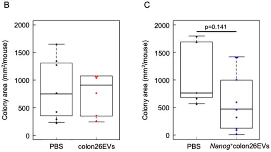 EVs isolated from Nanog+colon26 cells and colon-26 cells were confirmed by Western blotting using EVs markers such as CD81, TSG101, and Alix (Figure 3). Moreover, the absence of a negative marker, GM130, was also confirmed. Next, the circulation of EVs in the body was examined by injecting NIR815-labeled EVs (100 µL of 50 µg/mL) from the tail vein. Three hours after the injection, organs were excised for fluorescent image analysis. The liver showed the highest uptake of EVs among the seven organs (Figure 4A). In the lung and spleen, the uptake of Nanog+colon26EVs was higher than that of colon26EVs (Figure 4B). In the liver, the amount of Nanog+colon26EVs taken up tended to be greater than that of colon26EVs, although the difference was not statistically significant. Then, the effect of Nanog+colon26EVs on the metastasis of colon cells to the liver was investigated. Nanog+colon26EVs or colon26EVs were administered nine times via the tail vein at 100 µL (50 µg/mL) (Figure 5A). Nanog+colon26 cells were then injected into the spleen, and 2 weeks later, the mice were euthanized by cervical dislocation, and the livers were removed. The livers were cut into lobes and photographed. The area of tumors in the images was added up per mouse. Mice treated with colon26EVs exhibited reduced metastasis compared to those treated with PBS (Figure 5B,C). It is noteworthy that two of the mice treated with PBS died within two weeks of the injection of Nanog⁺colon26 cells, but all mice treated with Nanog⁺colon26EVs survived for two weeks.