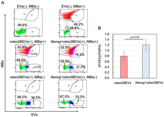 If cells that have taken up EVs have a greater tendency to take up MBs, it is expected that P1/P2 will be larger. However, a large P1/P2 ratio may also simply indicate that EVs themselves are more likely to be taken up by cells. Therefore, it is necessary to offset such an effect specific to EVs. This effect may be estimated from flow cytograms of MB negative controls. If EVs themselves are likely to be taken up by cells, it is expected that P3/P4 will be large. Therefore, we defined the effect on phagocytic activity as the net effect of EVs on the MBs uptake that may be given by [P1/P2] [in (colon26EVs(+), MBs(+)), (Nanog+colon26EVs(+), MBs(+))]/[P3/P4] [in (colon26EVs(+), MBs(−)), (Nanog+colon26EVs(+), MBs(−))]. The effect of Nanog+colon26EVs was greater than that of colon26EVs (Figure 6B).