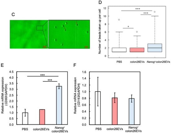 The phagocytic activity of J774.1 cells was estimated by means of a microbeads (MBs) uptake test. EVs were stained with a fluorescent dye, PKH26 (Ex: 551 nm, Em: 567 nm, DOJINDO). FITC-labeled microbeads (FITC-MBs) (Ex: 441 nm, Em: 486 nm, Sigma, Kanagawa, Japan) were incubated at 37 °C for 1 h in RPMI medium containing 10% heat-inactivated FBS for opsonization. J774.1 cells were incubated in RPMI medium with or without FITC-MBs and/or PKH26-EVs for a period of 2 h. Following this incubation period, the J774.1 cells were collected for flow cytometry analysis using the FACSAriaII (BD Bioscience). Phagocytic activity was also analyzed at the single-cell level by fluorescent microscopy. In this case, EVs were used without fluorescent labeling. The cell suspension was then placed in a hemocytometer, and bright field and fluorescent images were taken with a fluorescent microscope. The bright field and fluorescent images were merged using ImageJ to determine the percentage of cells that had taken up MBs and the number of MBs taken up by each individual cell. Three wells were prepared for PBS, colon26EVs, and Nanog+colon26EVs groups and 200 to 300 cells were placed in each well.