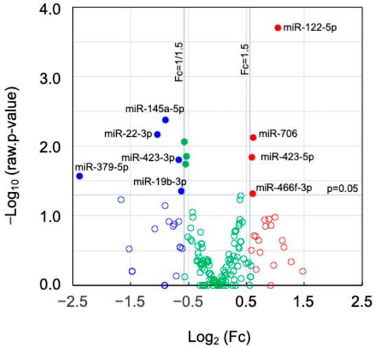 A volcano plot of miRNAs. Fold change (Fc) and p-value in statistical significance; (●) Fc ≥ 1.5 and p < 0.05, (●) Fc ≤ 1/1.5 and p < 0.05, (●) 1/1.5 < Fc < 1.5 and p < 0.05, (○) Fc ≥ 1.5 and p ≥ 0.05, (○) Fc ≤ 1/1.5 and p ≥ 0.05, (○) 1/1.5 < Fc < 1.5 and p ≥ 0.05, where Log2(1.5) = 0.585, Log2(1/1.5) = −0.585, −Log10(0.05) = 1.301.