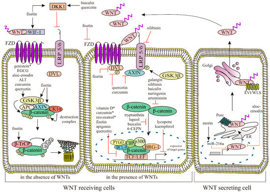 As demonstrated, natural compounds can affect the canonical WNT signaling pathway in various cancers at various stages, and their mode of action is briefly summarized in Figure 2.
