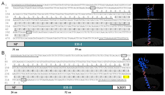cDNA sequences, deduced amino acids, and three-dimensional structural characteristics of EH I (A) and EH II (B). The start and stop codons are marked with boxes, the primers are marked with arrows, the signal peptide is marked with bold black underlines, the mature peptide is marked with gray shading, and the structurally conserved cysteine residues are marked with bold. Yellow shading is used to mark the cleavage site. * indicates the termination signal.