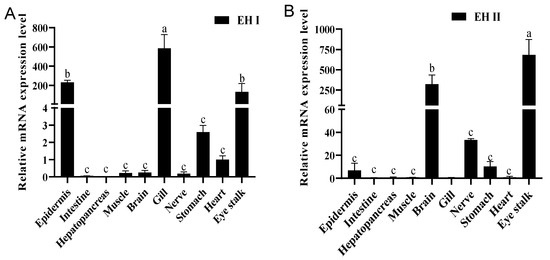 Relative expression of EH I (A) and EH II (B) in different tissues of Litopenaeus vannamei. The relative expression levels of EH I and II in 10 tissues were detected via qRT–PCR, and the statistics were calculated via the 2−ΔΔCT method and are expressed as the means ± standard errors of the means (n ≥ 3). Lowercase letters indicate significant differences, with different letters showing a significant difference between groups.