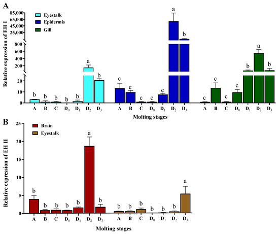 Expression of EH I (A) and EH II (B) in tissues with significantly higher expression during different stages of molting (n = 3). Lowercase letters indicate significant differences, with different letters showing a significant difference between groups.