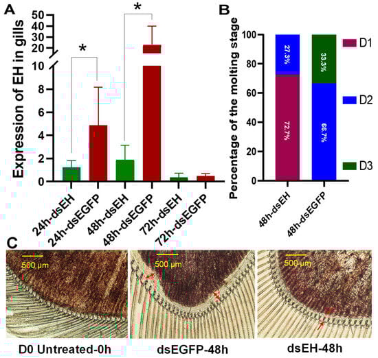 Effects of dsEH I injection on EH I expression in gills (A), molting progression (B), and molting microscopic characteristics (C). * represents significant differences, and p < 0.05. Arrows and bidirectional arrows are used to mark the space between the cuticle and epidermis.