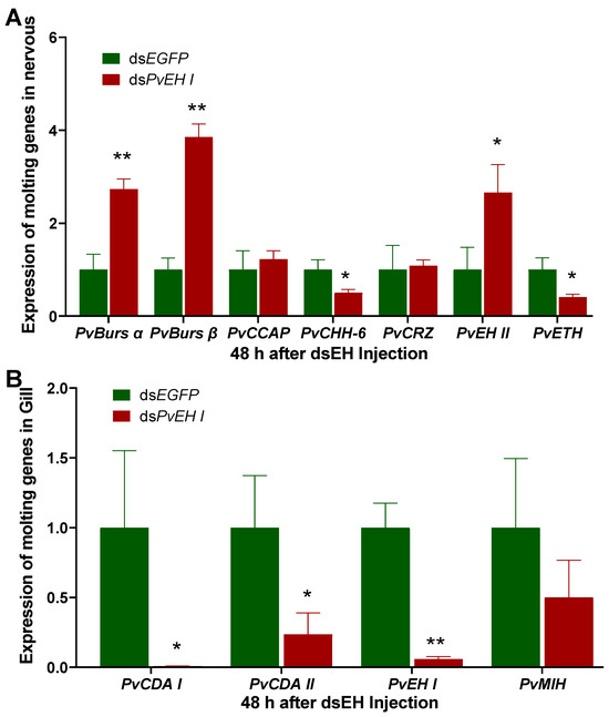Effects of EH interference on the expression of molting-related genes in the nervous system (A) and gills (B). Due to the high expression of different molting-related genes in different parts of nervous systems, we use the whole nervous system as samples (including brain, eyestalk, circumesophageal ganglion, ventral nerve cord, etc.). * and ** represent significant differences and represent p < 0.05 or p < 0.01.