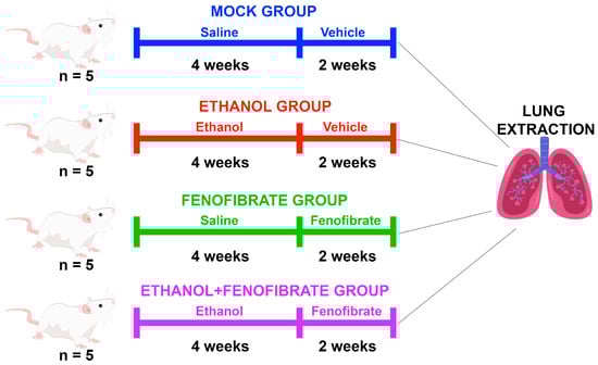 The evidence above strongly supports the hypothesis that alcohol intake leads to lung inflammation. These results highlight the need for effective therapies to reduce the inflammatory effects of alcohol in patients with AUD. However, the role of the drug fenofibrate in decreasing ethanol-induced lung inflammation and damage is entirely unknown. Interestingly, the anti-inflammatory effect of fenofibrate has been reported in another mouse model of lung inflammation and allergic asthma []. In this study, 30 mg/kg/day of fenofibrate administration reduced NF-kB activation in the lungs of mice previously induced with asthma.