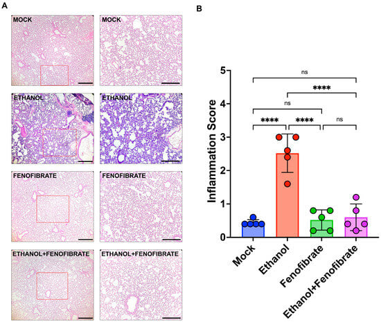 Fenofibrate reduces inflammation induced by ethanol. (A) Hematoxylin–eosin (H/E) stainings of lung sections from animals of all the experimental groups were examined by microscopy under 40× (left) and 100× (right) total magnification to identify the presence of inflammatory infiltrates. The images in the right column represent the magnification of the red square indicated in the pictures in the left column. The left scale bar indicates 500 μm, and the right scale bar indicates 100 μm. (B) Quantifications of stained sections were performed according to a scoring system described in Section 2. Data were analyzed using a two-way ANOVA test and expressed as mean ± SD. ns = non-significant; **** = p < 0.0001.