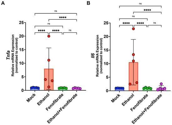 Fenofibrate reduces pro-inflammatory markers in animals injected with ethanol. Quantifying mRNA levels of Tnfα (A) and Il6 (B) was performed using qPCR. Data were analyzed using a two-way ANOVA test and expressed as mean ± SD. ns = non-significant; **** = p < 0.0001.