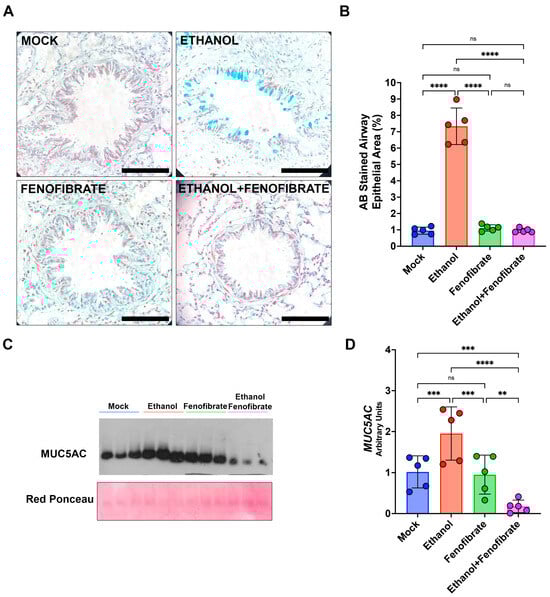 Fenofibrate reduces mucus in the airways of animals injected with ethanol. (A) Alcian blue (AB) stainings of lung sections from animals of all the experimental groups were examined by microcopy under 400× magnification to identify the presence of mucus in the airways. The bar indicates 100 μm. (B) Quantifications of the AB-stained area were performed according to the description presented in Section 2. (C) Western blot of MUC5AC showing three representative animals of each experimental group. Red Ponceau staining is shown as internal control. (D) Quantification of protein levels of MUC5AC in all animal groups. Data were analyzed using a two-way ANOVA test and expressed as mean ± SD. ns = non-significant; ** = p < 0.01; *** = p < 0.001, **** = p < 0.0001.