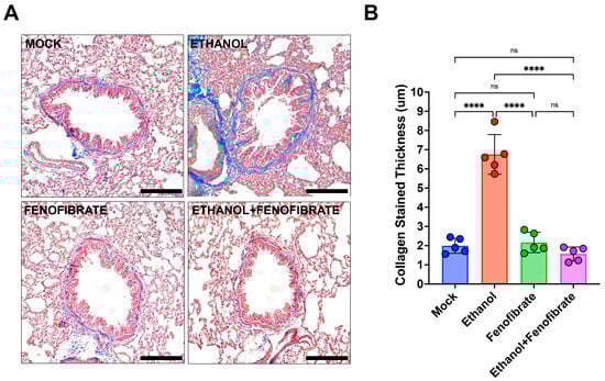 Fenofibrate reduces collagen deposition in the airways of animals injected with ethanol. (A) Masson Trichrome staining of lung sections from animals of all the experimental groups was examined by microcopy under 100× magnification to identify the presence of collagen deposition around the airways. The bar indicates 100 μm. (B) The collagen-stained area was quantified according to the description presented in Section 2. Data were analyzed using a two-way ANOVA test and expressed as mean ± SD. ns = non-significant; **** = p < 0.0001.
