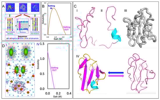The effect of salts on protein solubility beyond “salting-in/salting-out”. (A) Sequence–structure relationship of proteins. Based on the sequences as represented by five types of amino acids, proteins can be classified into high complexity or random (I), and low-complexity or non-random (II) sequences. A portion of proteins of the high-complexity sequence can fold into uniquely folded structures soluble with high concentrations of salts (III), while many of proteins of the low-complexity sequence remain intrinsically disordered (IV). Furthermore, ~30% proteins of both high- and low-complexity sequences can fold in the membrane environments (V). Interestingly, a large number of proteins of both high- and low complexity sequences appear to be insoluble in vivo with high concentrations of salts (VI). (B) The classic curve of protein solubility versus salt concentration for a well-folded protein which consists of “salting-in” and “salting-out” phases. (C) Solution conformations of insoluble proteins solubilized in unsalted water. Four groups of conformations have been observed so far: (I) highly disordered state without any stable secondary and tertiary structures; (II) partially folded state with some secondary but without tertiary structures; (III) molten globule-like state with secondary structures as well as dynamic tertiary packing; and (IV) coexisting folded and unfolded states exchanging in equilibrium. (D) A model to rationalize how salt ions affect the solubility of an insoluble protein. (I) An unrefoldable and insoluble protein in unsalted water with the solution pH several units away from its pI. Small cyan spheres stand for water molecules and green ellipsoids for protein molecules with a large number of hydrophobic side chains exposed. (II) Protein molecules in the presence of a small number of salt ions (larger red spheres). In addition to imposing non-specific electrostatic screening, the presence of salts also provides specific anion binding to protein residues, thus altering the surface electrostatic potential. Furthermore, salts also change the hydration structure as well as protein dynamics, as represented by the broken lines of green ellipsoids. (III) The complex interplay of these salt effects results in aggregation of the protein. (IV) The unique curve of protein solubility versus salt concentration for an insoluble protein. Figure 1A was adapted from Figure 1a in Ref. [19].