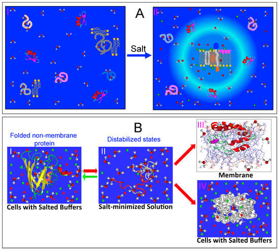 Therefore, the capacity for membrane interaction appears to be inherently encoded in all well-folded, non-membrane proteins (I of Figure 2B), although it is typically locked within their native folded structures. When these proteins become destabilized or their structures are disrupted due to genetic factors, such as disease-associated genetic variations, including mutations, truncations, or splicing alterations; as well as due to pathological, environmental, or aging-related factors, such as post-translational modifications (PTMs), disulfide bond reduction, cofactor loss, or oxidative modifications/fragmentation, their conformations become disordered to varying degrees. These disordered states are soluble only in salt-free water (II of Figure 2B). Remarkably, they can undergo distinct transitions depending on their environments. For example, they may transform into membrane-associated proteins (II of Figure 2B) upon encountering membranes or aggregate within cells in the presence of saline buffers (IV of Figure 2B). These transitions are tightly regulated by the intricate interplay between proteins, water, salt ions, and phospholipid molecules. Importantly, in all cases, the transition is associated with the release of bound water molecules into the bulk solvent, a process that can entropically drive the transition.