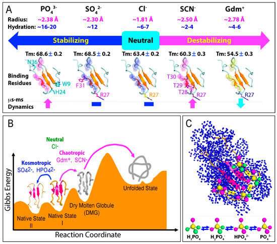 The interaction of salt ions with proteins is primarily influenced by two key factors: charge density and degree of hydration [6,50,115,116,117,118,119]. As shown in Figure 4A, the Gdm+ cation and SCN− anion have large ionic volumes but low charge numbers, resulting in low charge densities. Additionally, they exhibit weak hydration, with only 4–6 water molecules surrounding Gdm+ and 2–4 water molecules surrounding SCN−. Consequently, both ions are thought to disrupt the hydration structure of proteins. In contrast, the SO42− and PO43− anions have both large ionic volumes and high charge numbers, leading to high charge densities. These anions also demonstrate significant hydration, with 12 water molecules surrounding SO42− and 16–20 water molecules around PO43−. Therefore, both ions are considered to stabilize the hydration structure of proteins. The Cl− anion, meanwhile, has a medium ionic volume and low charge number, resulting in medium charge density, and exhibits a moderate hydration degree with 6–7 water molecules surrounding it.
