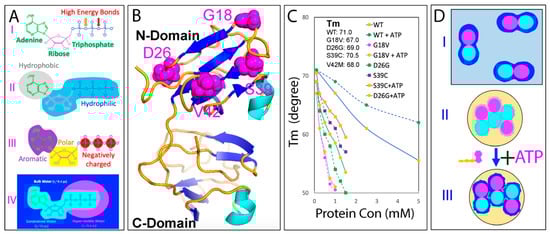 In this context, ATP and triphosphate appear to primarily facilitate protein folding by displacing water molecules that form hydrogen bonds with some key residues of the unfolded state. In the unfolded state (I of Figure 7A), the protein is heavily hydrated, with key residues interacting with water molecules through hydrogen bonds, which creates a kinetic barrier to folding. The introduction of ATP or triphosphate disrupts these water–protein interactions, loosening the water molecules and initiating the folding process (II of Figure 7A). The release of water molecules from the bound state to bulk water during folding also increases entropy, thus energetically driving folding. However, due to the exposure of the hydrophobic patches in such a protein with mutated deficits or highly dynamic tertiary packing, excessive amounts of triphosphate can lead to aggregation, caused by strong electrostatic screening effects. In contrast, ATP not only promotes folding through its triphosphate group but also enhances thermodynamic stability. This may be achieved through dynamic interaction of the aromatic base ring of ATP with the exposed hydrophobic patches or filling structural cavities, thus protecting these patches from exposure to bulk water (III of Figure 7A) [128]. This mechanism underscores that ATP and triphosphate enhance the folding propensity already encoded in the protein sequence. Indeed, ATP was unable to induce folding of intrinsically disordered domains, such as the prion-like domain of TDP-43 [190] and the RGG-rich domain of FUS [73], even at a 1:400 ratio, as these sequences inherently lack the capacity to form folded domains.