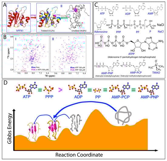 Very unexpectedly, ATP has been discovered to completely convert C71G-hPFN1 into the folded population even at a ratio of 1:2 (I of Figure 6B) and to transform the nascent hSOD1 into an equilibrium of the folded and unfolded states at 1:8 but without any specific binding to two proteins [128]. To decode the underlying mechanism, the effects of 12 related compounds (Figure 6C) were further visualized by systematic NMR titrations. Notably, ATP and triphosphate were both able to completely convert the unfolded state of C71G-hPFN1 into its folded state at a 1:2 ratio (II of Figure 6B). In contrast, TMAO, a well-known molecule for promoting protein folding [186,187,188], showed no detectable induction, even at high ratios up to 1:2000, where C71G-hPFN1 instead precipitated. These results suggest that ATP and phosphate exhibits the strongest folding-inducing capacity observed to date.