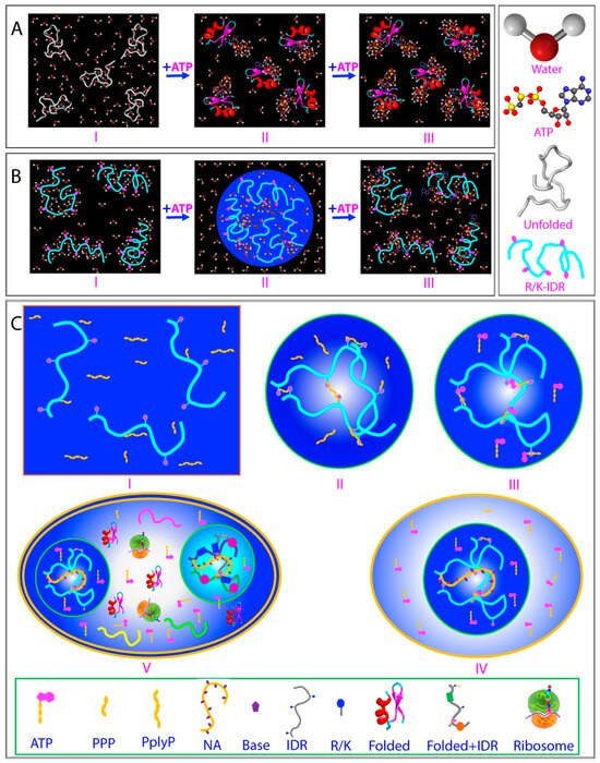 LLPS has been increasingly proposed as a mechanism for concentrating and compartmentalizing biological molecules even at extremely dilute concentrations in aqueous environments [245]. In light of this, here, a mechanism is proposed to emphasize the role of ATP in the origin of protocells. In the early stages of biochemical evolution (I of Figure 7C), the water body was likely highly unsalted and slightly acidic, conditions under which primordial peptides and proteins were soluble. The abundant presence of polyphosphate and triphosphate could have driven phase separation of primordial peptides and proteins with cationic residues, thereby concentrating these rare biomolecules (II of Figure 7C).