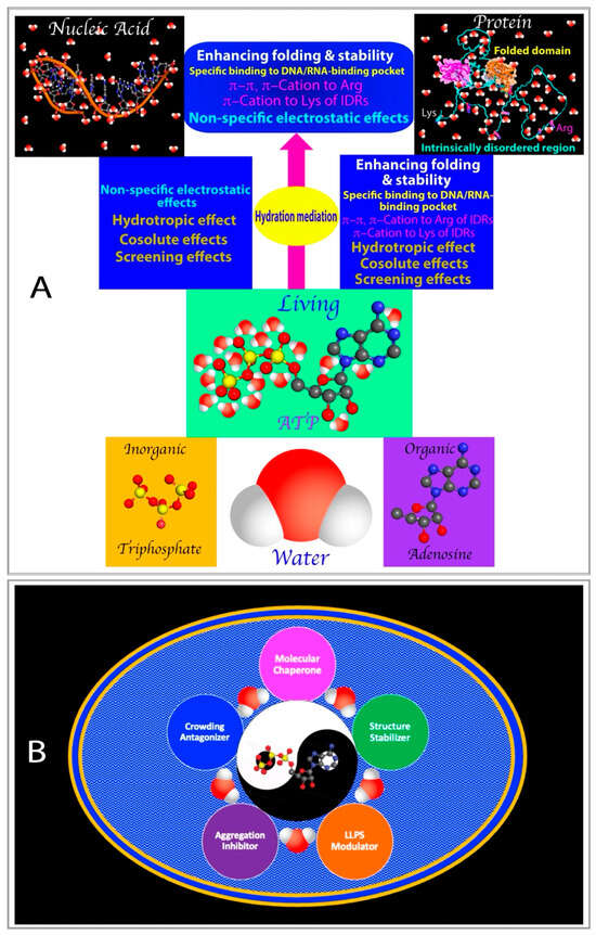 Indeed, ATP has been found to function as a biological hydrotrope at concentrations exceeding 5 mM, dissolving LLPS and protein aggregates or fibrils [140,141]. This newly discovered role is attributed to ATP’s amphiphilic nature, comprising a hydrophobic adenine and a hydrophilic triphosphate moiety (II of Figure 5A). Specifically, the aromatic purine ring of ATP is thought to cluster over hydrophobic regions of protein droplets or aggregates, while its triphosphate group interacts strongly with bulk water, thereby facilitating the dissolution of LLPS and aggregates.