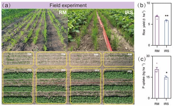 Intercropping significantly modified and inhibited rice growth, P uptake and soil microbiota of rice in the intercropped rice/soybean (IRS) treatment in northern China. Our results showed that intercropping with soybean significantly decreased the yield and P uptake of rice compared to the rice monoculture by 13.6% and 28%, respectively (Figure 1b,c).