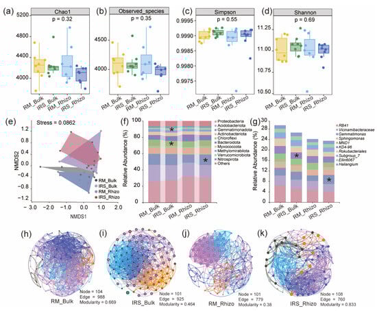 Intercropping changes microbial community composition. (a–d) Bacterial alpha diversity of Chao1, Observed species, Simpson and Shannon index. (e) Non-metric multi-dimensional scaling (NMDS) analysis of bacterial communities in bulk soil (RM_Bulk and IRS_Bulk) and rhizosphere soil (RM_Rhizo and IRS_ Rhizo) of rice plants grown in monoculture and intercropped soil (bulk: n = 4, rhizosphere: n = 4). (f,g) Phylum and genus level distribution of bacteria communities in the bulk and rhizosphere of rice plants grown in rice monoculture and intercropping soils (bulk: n = 4, rhizosphere: n = 4). Asterisks indicate significant differences between treatments (ANOVA, FDR-corrected LSMeans, *, p < 0.05). (h–k) Co-occurrence patterns of microbial communities in bulk soil (RM_Bulk and IRS_Bulk) and rhizosphere soil (RM_Rhizo and IRS_ Rhizo) of rice plants grown in monoculture and intercropping soil (bulk: n = 8, rhizosphere: n = 7–8).