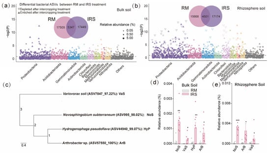 Intercropping enriched specific rhizosphere-associated bacteria in rice plants. (a,b) Manhattan plot of ASV-enriched bacteria in the bulk and rhizosphere soil of rice plants growing in in rice monoculture and rice/soybean intercropping mode soils. (c) Phylogenetic trees based on cultured bacterial strains isolated from rice grown in monocropping and rice/soybean intercropping soils. (d,e) Similarity (>97%) of the four selected strains with detected ASVs, showcasing their relative abundances in bulk and rhizosphere soil. In (a,b) each dot or triangle represents a single ASV. ASVs enriched or depleted in intercropping soil are represented by filled or empty triangles, respectively (FDR adjusted p < 0.05, DESeq2). Significant differences between treatments are indicated by different asterisks (ANOVA, FDR-corrected LSMeans, *, p < 0.05; **, p < 0.01; ***, p < 0.001).