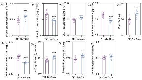 SynCom inoculation significantly increased Pi concentration of rice shoots in pot experiments, while reducing Pi concentration and P concentration in roots, suggesting that the SynCom regulated aboveground and belowground P allocation in rice (Figure 4a,b). Additionally, the reduced root:shoot ratio of P uptake with SynCom inoculation further confirmed increased P transfer from root to shoot compared to the control. Concomitantly, SynCom inoculation significantly increased both leaf and root dry biomass without affecting the root-to-shoot biomass ratio (Figure 4f–i).
