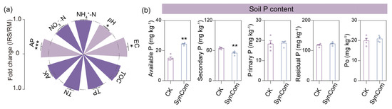 We further explored the mechanisms behind the growth-promoting effect of the SynCom on rice during the seedling stage. First, we evaluated the effectiveness of the SynCom in altering soil nutrient content. SynCom inoculation significantly reduced soil pH in alkali soil while increasing available P concentration in the rice rhizosphere (Figure 5a). Similar results have also been reported in other intercropping systems [9,37]. The potential mechanism likely involves a decrease in pH due to the release of lactic acid, acetic acid, and citric acid from rhizosphere bacteria (e.g., Variovorax paradoxus), which solubilize soil-insoluble phosphates and enhance their bioavailability for plant growth [38,39,40]. Further analysis of soil P fractions showed that SynCom inoculation significantly increased available P content in the soil by 62.5%, while reducing secondary P by 14.6% (Figure 5b). This suggests that the SynCom facilitates the dissolution of soil P minerals (such as Ca–P, Al–P, Fe–P, and O–P) [41], which is consistent with previous studies indicating that beneficial bacterial inoculation can convert soil insoluble organic P or inorganic P into plant-absorbable forms [42]. For example, Variovorax paradoxus, as a representatives of P-cycling bacteria, can produce alkaline phosphomonoesterase and dissolve inorganic P to increase its bioavailability [40]. Novosphingobium barchaimii exhibits tricalcium phosphate solubilizing activity [43]. Arthrobacter sp. is considered a major decomposer of organophosphorus, including phosphonates and phosphate esters [44]. Together, our result confirms that a SynCom comprising phosphate-solubilizing bacteria increases soil P bioavailability for plant absorption and utilization.