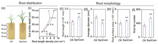 Inoculation with SynCom affects root distribution and root morphology of rice plants. (a) Schematic diagrams of potted rice. (b) Root length density of rice treated with SynCom and sterilized water. n = 4 biological replicates were measured for all treatments. Data are average ± s.e.m. (c–f) Root length, average diameter, root surface area, root tip number of rice plants inoculated with sterilized water (CK) or bacterial synthetic community (SynCom). n = 4 biological replicates were measured for all treatments. Data are average ± s.e.m. Data points represent individual replicate samples. Asterisks indicate significant differences between treatments (ANOVA, FDR-corrected LSMeans, ***, p < 0.001; n.s., not significant).