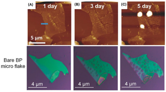 AFM images of an unmodified BP sheet exposed to air for (A) 1 day, (B) 3 days, and (C) 5 days; photographs of a bare BP flake exposed to air for 0, 4, and 8 days (adapted from [35] with permission).