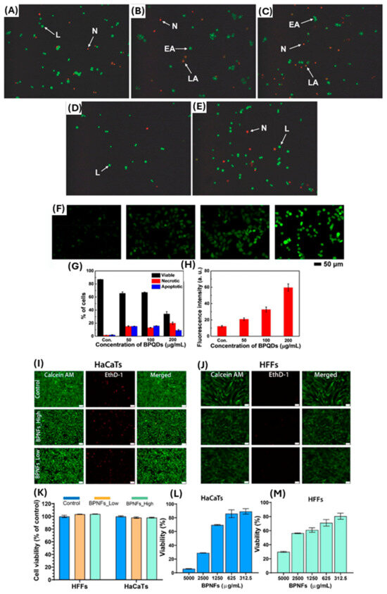 (A–E) AO/EB staining of HCoEpiC cells after 24 h exposure of layered BP observed by inverted fluorescence microscopy at various concentrations. The figure panels: (A) control and (B–E) 10 µg mL−1–50 µg mL−1). The arrows on these panels are as follows: L: live cells; EA: early apoptotic cells; LA: late apoptotic cells; N: necrotic cells. Adapted with permission from [63]. (F–H) show cell apoptosis and oxidative stress on HeLa cells; (F) intracellular ROS production in cells treated with the different concentrations (0, 50, 100, and 200 μg/mL) of BPQDs. (G,H) The corresponding analysis on percentage of cells and fluorescence intensity of ROS level, adapted from [64] with permission. (I–M) The panel shows the effect of BPNFs on in vitro skin cell viability at moderate concentrations. (I,J) Shows representative images of HaCaTs and HFFs stained with Calcein AM (green), and dead cells stained with EthD-1 (red) following 24 h of treatment with BPNFs low (1000 µg mL−1) and BPNFs high (1500 µg mL−1). (K–M) The corresponding cell viability after treatment for both skin cells at low and high concentrations compared to control. Data adapted with permission from [12]. Scale bar 50 µm. Data are shown as means ± SEM.