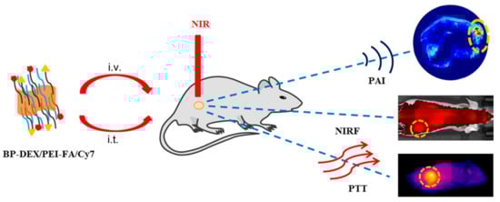 BP (BP-DEX/PEI-FA/Cy7) nanoparticles and their applications in photoacoustic (PA) imaging, near-infrared fluorescence (NIRF) imaging, and photothermal therapy (PTT) of cancer (i.t.: intratumoral injection, i.v.: intravenous injection). (Adapted from [68] with permission.)
