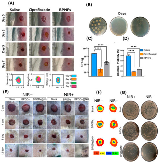BP improves wound healing and kills bacterial species with and without NIR in in vivo models. (A) Representative digital photographs and schematic traced wounds demonstrating the rate of healing and wound closure. (B) Representative images of plates displaying colonies formed after treatment with saline, ciprofloxacin, and BPNFs respectively. (C) Quantification of wound bacterial levels by assessment of colony counts (CFU g−1) at day 7 post wounding. (D) Quantitative analysis of average bacteria viability from confocal images (%). * denotes significance between groups using one-way ANOVA where **** p < 0.0001. (Adapted from [12] with permission.) (E) Photographs of MRSA-infected wounds in diabetic rats and (F) schematic traced wounds demonstrating wound closure rates at 0, 4, 8, and 12. (G) CFU plates of remaining viable bacteria in tissue homogenates after treatment. (Adapted from [65] with permission.)