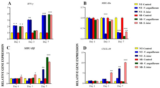 IFN-γ displayed robust expression increases by day 7 across both bacterial challenges in both species, with E. Sea Bass shown a notable peak of 3.899 upon V. anguillarum infection, reflecting its integral role in activating cellular immune responses and enhancing macrophage activity (Figure 5A). Post-infection, MHC-IIα and MHC-IIβ genes experienced marked downregulation by day 7, particularly in N. Tilapia following V. anguillarum (MHC-IIα dropping to 0.310), indicating differential antigen processing route adaptations between the two species (Figure 5B,C).