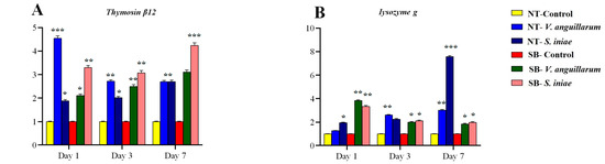 Antimicrobial peptides, including Thymosin β12 (Figure 6A) and lysozyme g (Figure 6B), were upregulated, underscoring their roles in immediate pathogen neutralization. Regarding the Leap 2 gene, exposure to S. iniae resulted the in significant upregulation of gene expression in both treatment groups. On day 1, the E. Sea Bass infected with S. iniae exhibited an expression level of 11.340 ± 0.220, while on day 7, the N. Tilapia infected with S. iniae reached 6.523 ± 0.100, indicating a strong and sustained immune response (Figure 6C). In the case of the β-defensin gene, exposure to V. anguillarum in N. Tilapia induced significant upregulation, particularly on day 3, with expression levels reaching 3.599 ± 0.070. Conversely, S. iniae exposure in N. Tilapia resulted in the highest expression on day 1, with levels of 2.403 ± 0.050 demonstrating varied temporal expression patterns in response to different pathogens (Figure 6D).