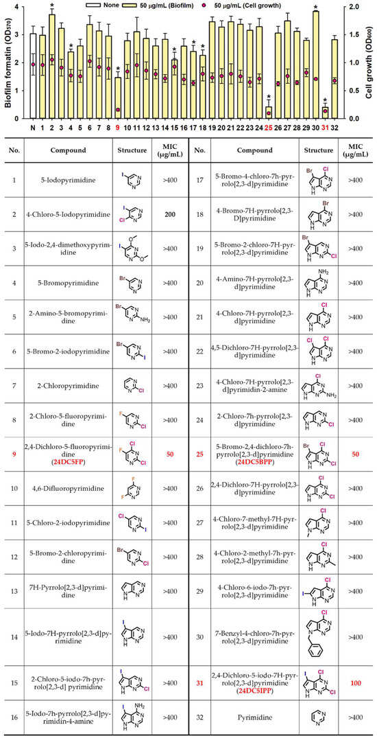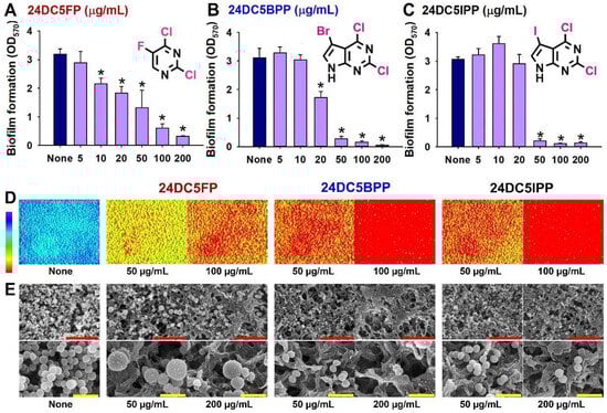 Chicago/Turabian StyleSim, MinHwi, Yong-Guy Kim, Jin-Hyung Lee, and Jintae Lee. 2024. "Antibiofilm Activities of Multiple Halogenated Pyrimidines Against Staphylococcus aureus" International Journal of Molecular Sciences 25, no. 23: 12830. https://doi.org/10.3390/ijms252312830