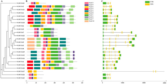 Phylogenetic relationship, exon-intron gene structure, and structure of conserved protein motifs in VcNF-YA transcription factors. (A) Phylogenetic tree was constructed based on the full-length sequence of the VcNF-YAs protein. (B) Motif composition in VcNF-YAs protein. The pattern of Motif 1–10 is displayed with boxes in different colors. Motifs in the amino acid sequence of VcNF-YAs were predicted using online MEME tool. (C) Exon-intron structure of the VcNF-YA transcription factors. Yellow boxes indicate exons. Green boxes indicate untranslated 5′- and 3′-regions. Black lines indicate introns.
